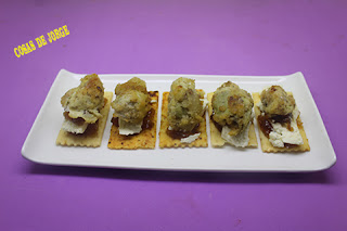Realmente las barritas de orégano son el doble de largas que las de la foto, pero aproveche las rotas, dejándolas a mitad de tamaño. Sobre cada media barrita colocamos una cucharadita de postre de mermelada. Sobre la mermelada colocamos una lonchita de queso fresco saladito. Sobre el queso colocamos otra cucharadita de mermelada y sobre esta la media alcachofa rebozada, sobrante de otra receta. Solo resta colocar nuestro aperitivo en una bandejita y servir. |