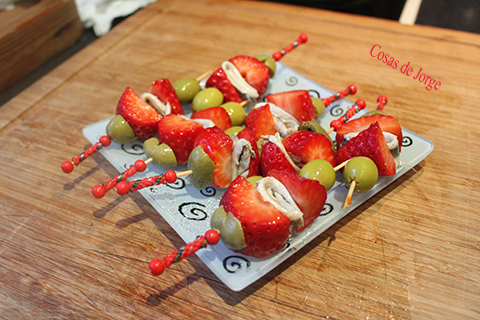 Lavamos y troceamos los fresones en cuatro trozos. Separamos las olivas partidas de sus huesos, desechando estos. A continuación vamos insertando en un palillo o similar media aceituna partida, un trozo de fresón, el lomo de boquerón doblado, otro trozo de fresón y finalizamos con la aceituna rellena. Repetimos la operación hasta terminar todos los ingredientes. Colocamos en un plato y rociamos de sal líquida de cítricos y aceite de oliva. Guardar en el frigorífico hasta el momento de servir. |