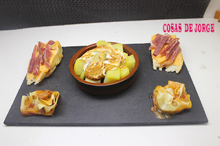 Aceitamos cuatro moldes de silicona pequeños e introducimos en ellos la pasta wonton, de forma que en el interior de la pasta introduzcamos salsa Boloñesa. Introducimos estos moldes en una vaporera y cocemos hasta que la pasta esté tierna y reservamos. Podemos aprovechar la vaporera para también cocer las patatas al vapor u otra verdura para futuras recetas. Untamos las rebanadas de pan con salsa Romesco, las partimos en dos, para que no se nos desmonten al comerlas y cubrimos de tiritas de jamón serrano. En una cazuelita de barro colocamos una patata cocida troceada, le añadimos mayonesa y salsa Romesco. Antes de servir colocar nuestra pasta wonton (sin desmoldar) al horno hasta que esté crujiente y caliente (10-15 minutos a 180º a partir de horno frío). |